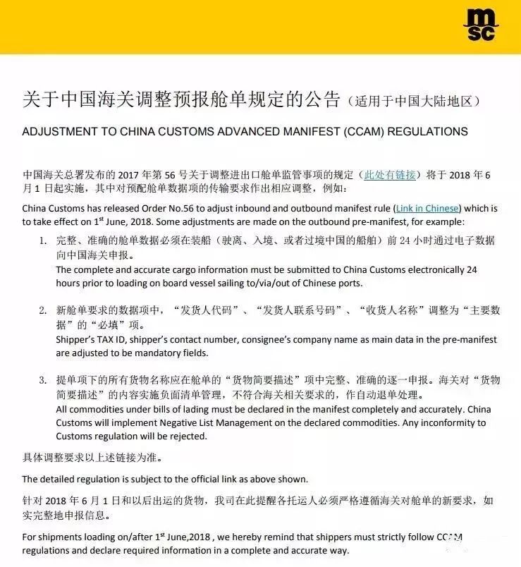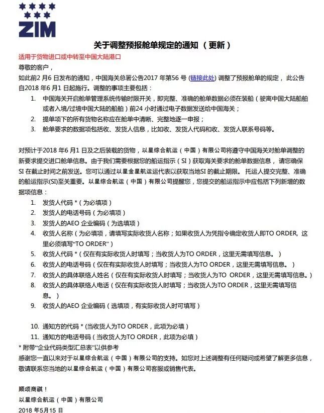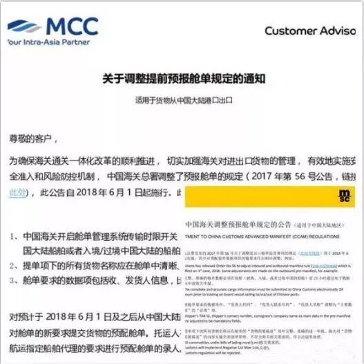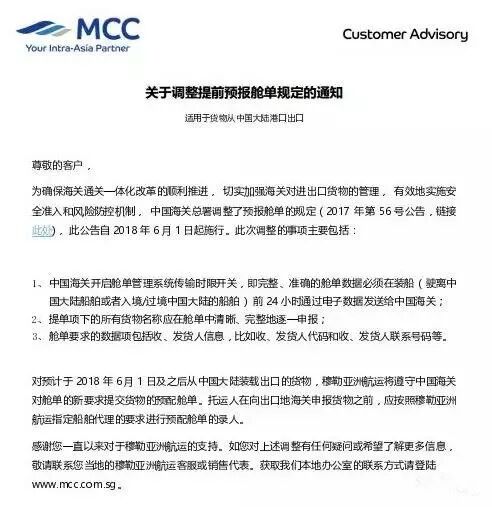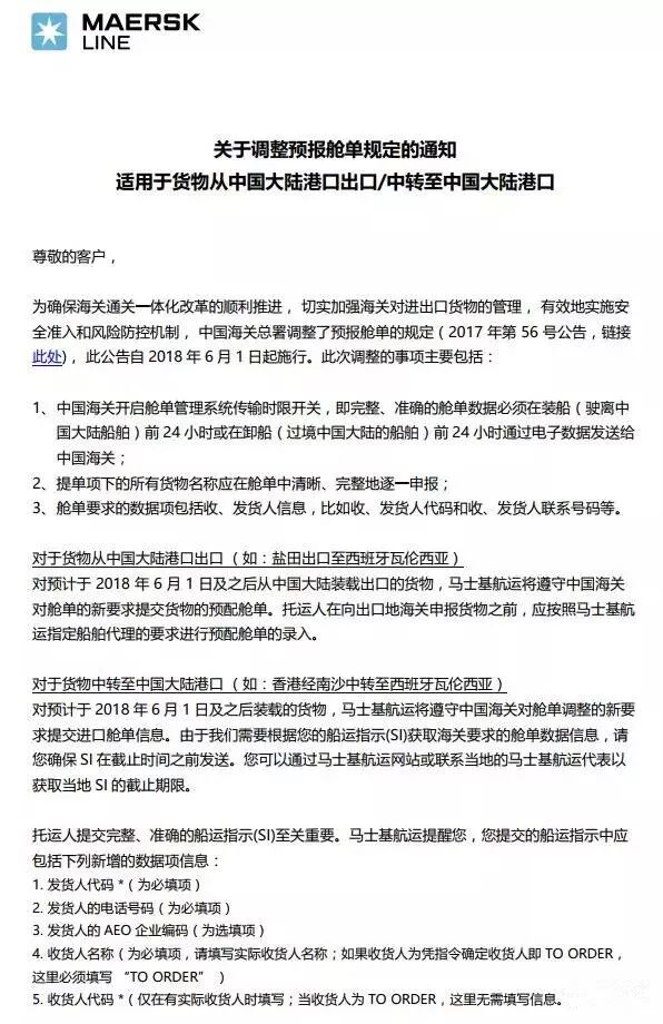 解答一:对进口至中国大陆或经中国大陆港口中转的货物而言,如装载船舶的预计离港日期为2018年6月1日及之后,货物的完整、准确的舱单数据必须在装船前24 小时前通过电子数据发送给中国海关。